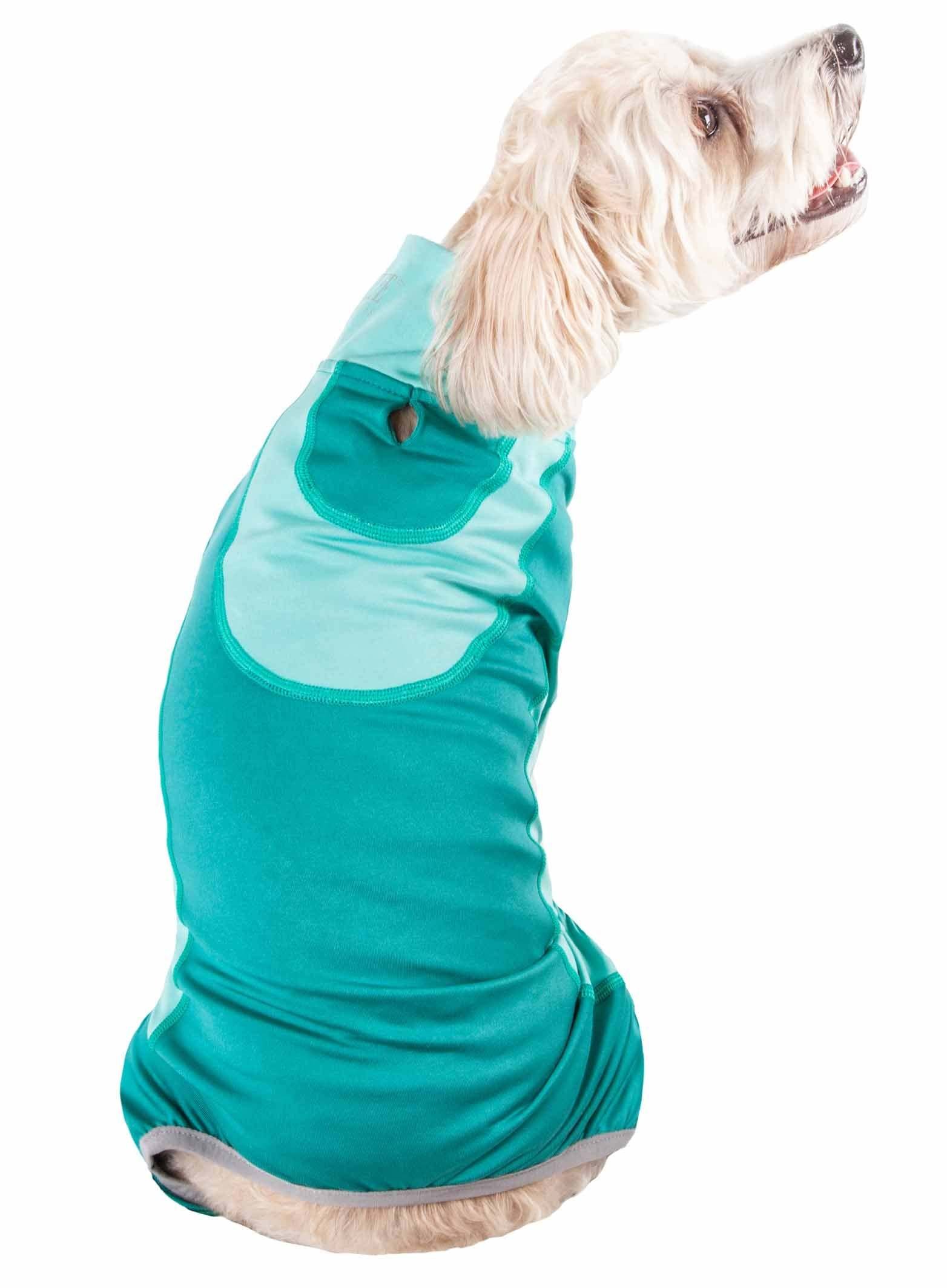 The Pet Life ACTIVE 'Warm-Pup' Dual-Toned Full Bodied Tracksuit is Next-Generation performance unleashed. Features a specially formulated Ultra-Lightweight Micro-knit system that maintains body temperature and features 4-way Stretch technology that moves better in every direction for premium Comfort and Mobility with strategic ventilation points for Breathability. Features a tapered and streamlined fit that's also expandable with stretch-banded lining that extends additional room for growth. This fabric features Quick-Drying properties that repels perspiration and dries really fast while offering Anti-Odor technology that assists with odor causing microbes. Offers UV Protection against the suns harmful rays and fitted to help assist in containment or collection of shedded hairs. Design features Dual Reinforced stitching at every seam for durability and a leash-slit along the backside, a fashion collar and a zipper underneath for convenient on and off access with Reflective Taping for added night visibility. Machine Washable. This style is part of our Pet Life Activewear Collection. Available in Multiple Sizes and Colors.