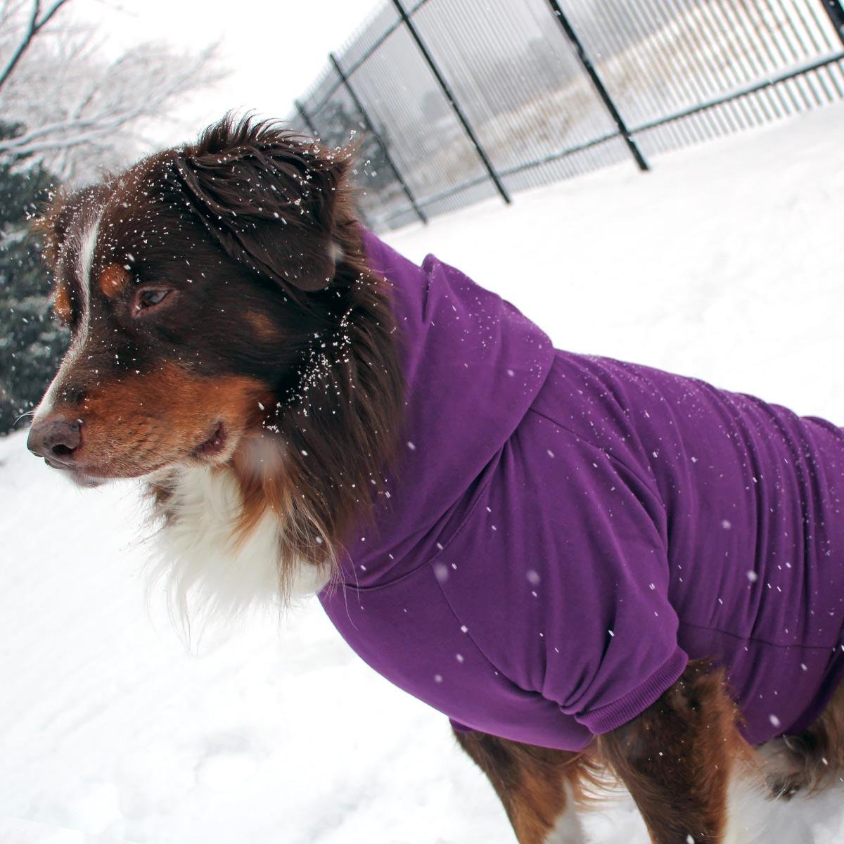 Your pup will love the comfort and style of this Doggie Design wardrobe essential. With the flexible fabric and ribbed trim, even hard-to-fit dogs will love the style of this pullover hoodie. We have used human-grade high-quality thicker material (290  GSM - gram per square meter) not usually seen in pet garments. This makes our dog hoodies a cozy choice for colder climates with the thick, plush material. The leash access hole at the base of the hood makes walks a breeze for dogs that prefer their hoods worn up or for pups that use a harness.